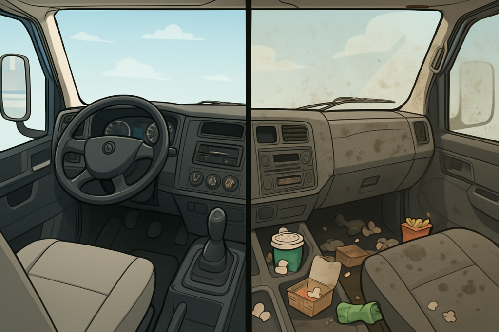- النظافة الداخلية: مقصورة نظيفة ومنظمة تساعدك على التركيز بشكل أفضل وتقلل من مصادر الإلهاء. كما أنها بيئة عمل أكثر صحة.