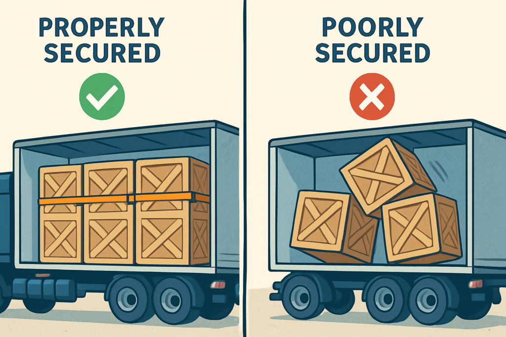 - تثبيت الحمولة بشكل آمن: تأكد من أن الحمولة مثبتة جيداً لمنع تحركها أثناء النقل، مما قد يسبب ضرراً للشاحنة أو للحمولة نفسها، أو يؤدي إلى حوادث.